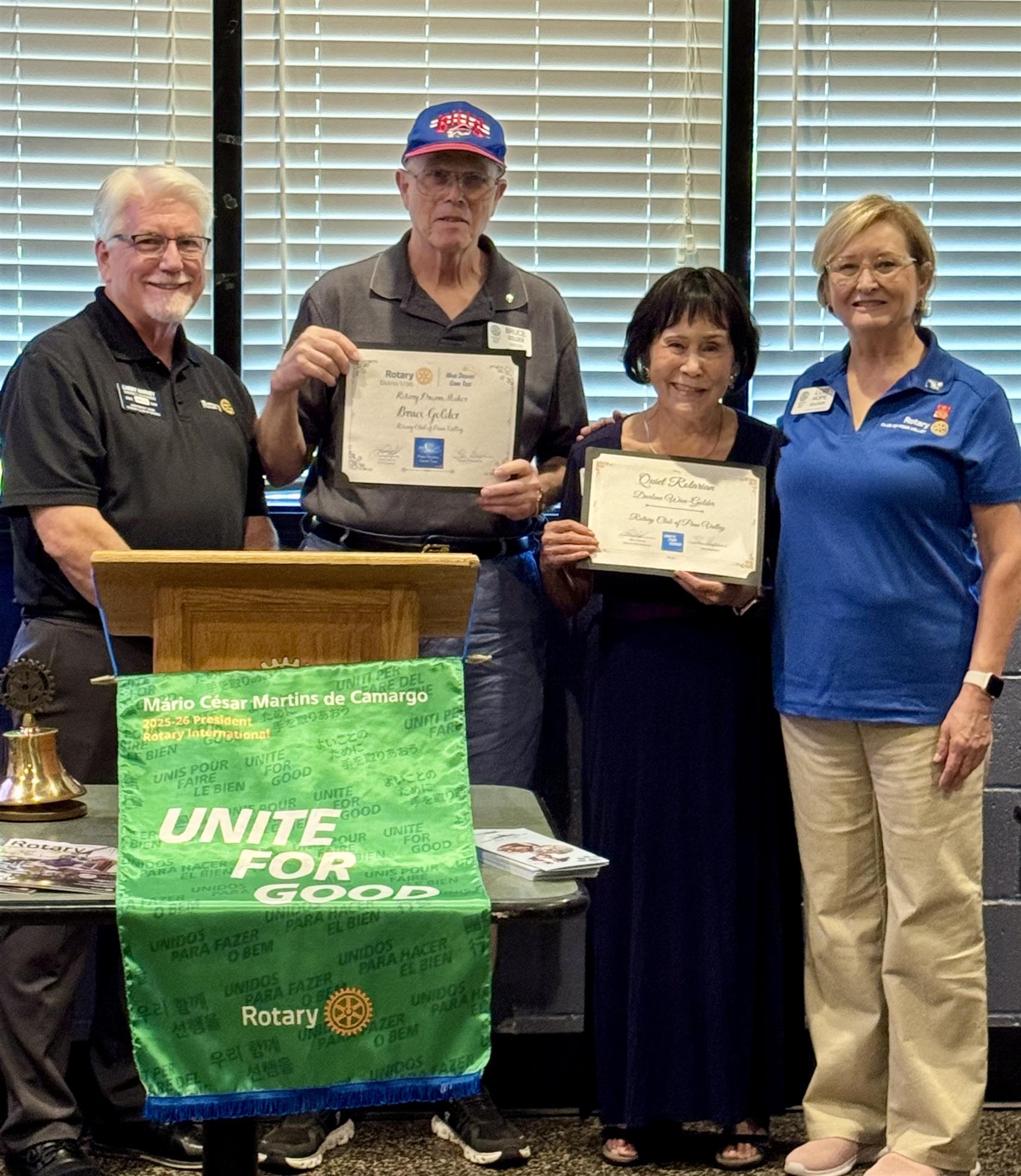 Notes from the President  Rotary’s focus for August is “Membership and New Club Development.” First and foremost, I want to say “Thank you” and express my gratitude for your continued active membership in the Rotary Club of Penn Valley. It’s truly an honor to work alongside each and every one of you! Our District 5190 Governor, Larry Harvey, was our honored guest at our August 5th meeting, along with Marcia Salter, our Area Governor. Larry provided insights to the club about how to increase membership as well as expanding membership through satellite clubs and inviting "Friends of Rotary” volunteers to help with events and projects. He also inducted Bridget Grant as a new member. Two of our members were honored .. Darleen Won-Golder with the Quiet Rotarian award and Bruce Golder for the Dream Maker award honoring his work with our club's scholarships I want to recognize and give thanks to our members who provide selfless service to Penn Valley and the surrounding communities this past month by way with “Wow” points collection at Holiday Market, participating in the “Hope for Nevada County” food drive and school supplies giveaway at Nevada Union HS, and for helping out at the United Methodist Church’s bratwurst booth at the Nevada County fair, as well as all the work that is done behind the scenes for the club and on behalf of Rotary! In Rotary Service and Spirit, Lori Hope, President Rotary Club of Penn Valley MEETING TIMES....1st and 3rd Tuesdays of the month, noon, Players Restaurant and Sports Bar, Penn Valley... August 19 meeting... Lola and the short Term Exchange student...Short Term Exchange or STE is a relatively new program here in District 5190. It's a Family to Family exchange for a short period, usually a few weeks, during the summer...We'll hear about the exchange when Lola (our student) comes to visit with her STE student from Germany...Plus we'll be inducting new members... Sept 2...Linda Lee, prospective new member, discusses her new book REFLECTIONS recounting her travels abroad through poetry...such a great inspiration... Sept 16...John Paul from the 49er Breakfast Club, will share his journey into Improv as a retirement exploration in a talk called "Reimagine Retirement".. learn why he chose this adventure for his retirement journey ***************************************************************** Mark your calendars.... Next Hospitality House cooking - August 27 Penn Valley Rotary club social Wanna see another side of foothill living? Interested in a Permaculture garden? PV Club's social on August 15, 5 pm.. Darleen Won Golder's friend Carrie is opening up her home to us for a wonderful social...Friday, August 15 at 5 pm..bring an appetizer to share and your drinks....address: 14447 Deer Bed Circle in Penn Valley...Sign up at the meeting on Tuesday... At the last meeting, Prez Lori asked each member to sign up for a task at the October event...please connect with Lori or come to the next meeting to get info on this club wide event...it's a all hands on deck to help raise funds for Polio Plus and the Western Gateway Dog Park... ***************************************************************************** Possible community Project.. The Nevada County Food Bank is in need of volunteers to help staff the monthly distribution at the Seventh Day Adventist Church...the volunteer at the church who as been the lead, is retiring and Brett Bentley is looking for another organization or organizations to take on the task....group meeting with PV Lions and PV Chamber is in the works for Thursday, Aug 14 at 4 pm...if you're interested, let Lindy know... We have been asked to pick up snack foods from the Nevada County Food Bank for Ready Springs and Williams Ranch schools each Friday...if you would like to help with this, contact Lindy during a meeting... SAD NOTE Our long time member (she's been a Rotary member since 1990) and friend, Paula Collins, passed away Friday evening at Atria memory care. Pamela spent a few hours with her that day. Her brother Peter is flying out from Detroit...we should have more news on celebrations. Please remember the wonderful times we had with Paula, those of us that knew her at Penn Valley Rotary and at 49er Breakfast Rotary and throughout the community through her work with Nevada County Gold magazine. Our MAILING ADDRESS!!! ...11354 Pleasant Valley Road, #134, Penn Valley, CA 95946